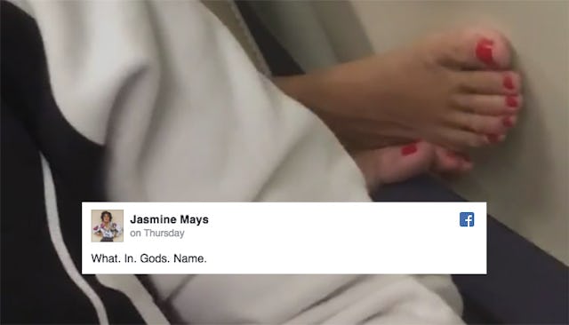 What is going on with people tossing their bare feet every which way on airplanes these days? We’ve seen nightmare footage before of this stinky affront to human decency, but this week, a woman named Jasmine Mays posted a video of another person’s feet on her armrest that has us rolling with laughter.