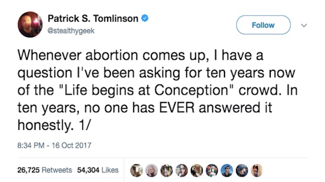 His name is Patrick S. Tomlinson, and he’s a science fiction writer. Last week, he took to Twitter to lay out the one question he’s been asking the “life begins at conception” contingent of anti-abortionists for ten years. In the decade he’s been asking it, he claims he’s never gotten a straight, or honest, answer.