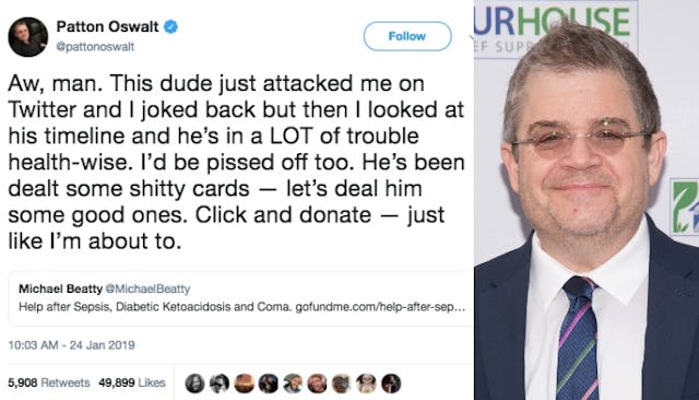 Here’s an unusually uplifting, positive Twitter story to brighten your day. A man named Michael Beatty tweeted Patton Oswalt some mean comments and the actor responded by checking out his Twitter page, finding out that he had medical struggles, and then helped pay his bills. Beatty was overwhelmed with gratitude and the exchange will make you believe that there’s some goodness left in the world.