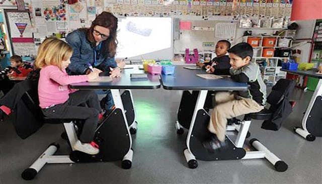 “I’ve seen a shift in my students’ behavior and engagement since the bikes arrived,” Harralson told NBC. “Thanks to good engineering, the pedals are essentially noiseless and don’t interfere with instruction or activities.” Oh, yeah. God forbid we interfere with instruction. Kids must focus, focus, focus!