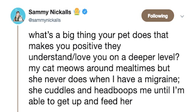 Adweek editor Sammy Nickalls asked her followers to share stories about their pets showing love and understanding on a deep level. Nickalls is also the creator of the hashtag #TalkingAboutIt, which has helped spur an ongoing dialogue about mental health on Twitter.