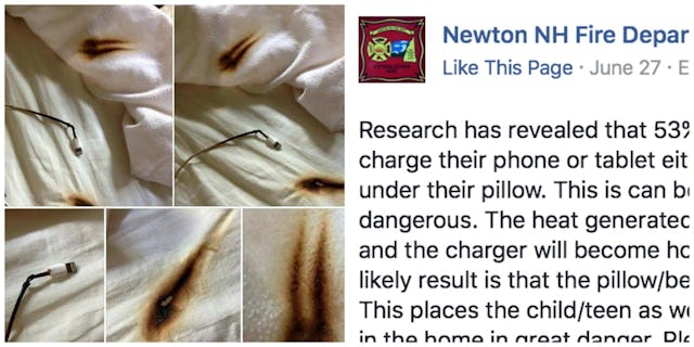 The fire department in Newton, New Hampshire, recently shared some really scary information and photos in a now-viral Facebook post. According to the fire department, “Research has revealed that 53% of children/teens charge their phone or tablet either on their bed or under their pillow. This is can be extremely dangerous.”