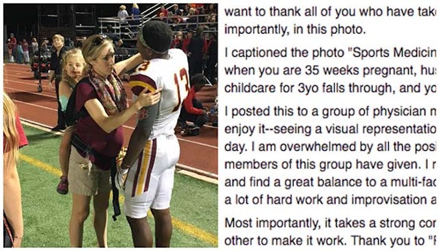 “A photo of me providing sideline coverage for my high school football team, Putnam City North, recently went viral,” she explains on her Facebook page. “This is what happens when you are 35 weeks pregnant, husband leaves town for the weekend, childcare for 3-year-old falls through, and you have a game to cover!”