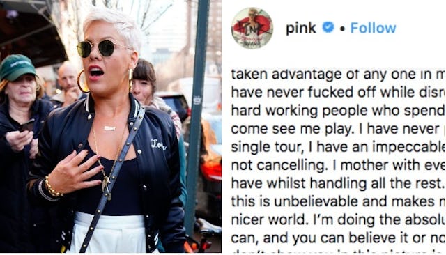 Pink defends herself after trolls suggest she’s faking sick to get out of performing