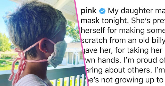 The homemade mask is exceptionally sewn together, and tied in the back with those soft, fluffy ribbons every ’80s child who wore ponytails and pigtails is familiar with (ah, nostalgia). It’s perfect. Pink says she’s proud of her daughter, too, for “taking her health into her own hands and thinking about others.” And, as always, she cuts right to the heart of the matter: