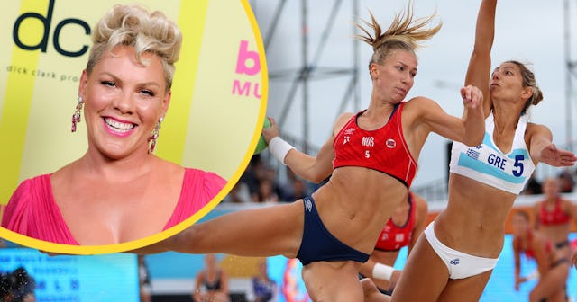 In case you missed these headlines last week, the sport of beach handball has some pretty darn sexist uniform rules. While men are allowed to compete in shorts and tank tops, women are required by international rules to wear midriff-bearing tops and tight, high-cut bikini bottoms when they play. Last week, the women’s national team from Norway made headlines around the world when they wore shorts to a Euro Finals match in protest of the rules. Now, Pink is speaking out in support.