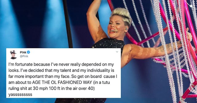 The pressure society puts on women when it comes to aging is unreal, especially in Hollywood. Actors and musicians are made to feel like they can’t possibly age, or they won’t be seen as desirable (by audiences or casting agents). Even a wildly talented artist (and acrobat, let’s be honest) like Pink struggles with her self-image and the aging process — which she just opened up about on Twitter.