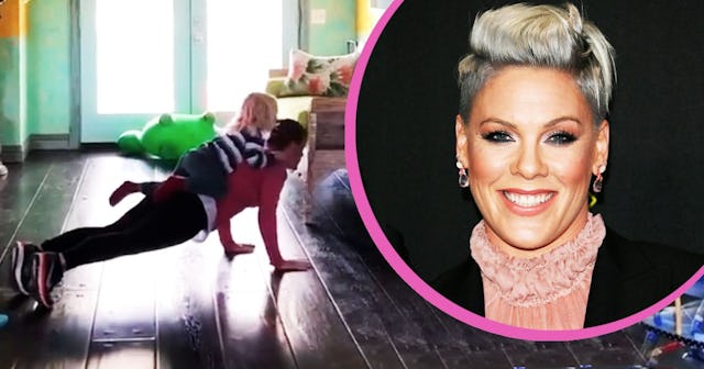 Taking to Instagram on Sunday, Pink shared a short video of her latest workout. In case you missed it, choreographer Ryan Heffington has been using Instagram Live to stream his “Sweatfest” dance class so that families can join in while stuck at home during this trying time. So, while Heffington’s class streamed in the background, Pink made the most of being home with her little boy by inviting him to be a part of her exercise routine.