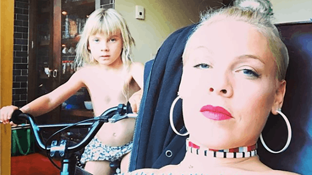 Pink looks into the camera with a face that says, “Try me. I want you to,” while her daughter stands behind her with a face that says, “I agree. You should try my mom. It’ll be great. I promise.” Pink captioned the photo with this: “Yeah, my kid rides her bike inside. Without clothes. And helmets. While I ignore her and look at my phone. #failingbeautifully #loveinthebigapple2017.”