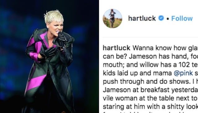 Sure, we may not all be traveling around the globe selling out stadiums on a world tour but we’ve all been the victims of bad kiddie illness timing. Hart shared the adorably sad pic of one-year-old son, Jameson, covered in a rash. “Wanna know how glamorous tour can be?” he wrote. “Jameson has hand, foot, and mouth; and Willow has a 102 temp. Both kids laid up and mama @pink still has to push through and do shows.”