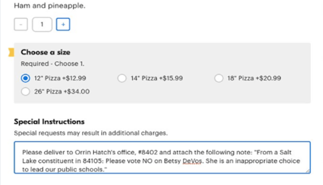 Silge – like many Americans – felt anxious about DeVos’s final Senate confirmation hearing last Monday and wanted to share her opinions with her elected official. But since no one was picking up the phone or calling Hatch’s constituents back, Silge opened her GrubHub app and ordered a 12-inch ham-and-pineapple pizza for the senator, the Washington Post reported. She asked that the following note be attached to the box: “From a Salt Lake constituent in 84105: Please vote NO on Betsy DeVos. She is an inappropriate choice to lead our public schools.” She even added a $10 tip for the worker’s extra effort.