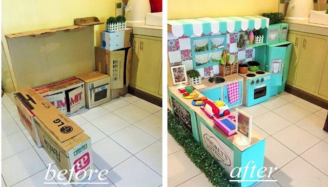 Honestly, what in the wide world of fucks is wrong with us that we are willing to spend upward of $200 on something we can make almost literally for free? That’s why these parents DIY-ing the shit out of cardboard boxes to make precious play kitchens for their kids are definitely on to something.
