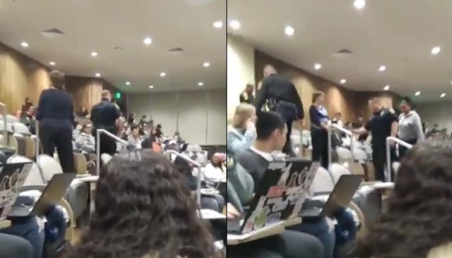 Several students took video of the incident, and one, Apurva Rawal, posted it on Twitter, stating, “This professor stopped class entirely and stepped out to call the police just because one student had her feet up on a seat in front of her. Mind you she wasn’t talking or interrupting lecture.”