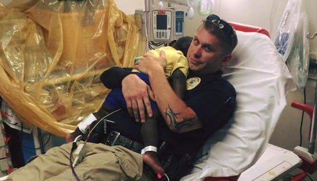 The police officer says he picked up the clearly frightened little boy to comfort him, because he was screaming and crying while being examined at the hospital. The baby quickly fell asleep on his chest and like any good daddy, he went with it. “What kicked at me was really just humanity. A screaming child sitting there getting evaluated by the hospital staff, I felt bad for him. So it was my empathy for him and just trying to be there for him because he had nobody else.”