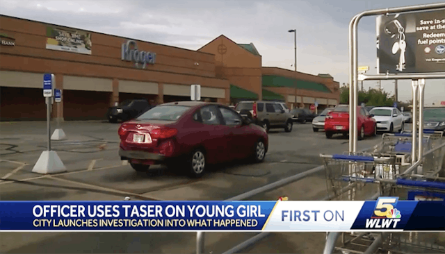 The officer hasn’t been identified, but reports say he was off-duty at the Kroger when someone alerted him to the girl, who was allegedly shoplifting. She allegedly ignored him when he asked her to stop, and that’s when he shot her in the back with a taser. A taser.