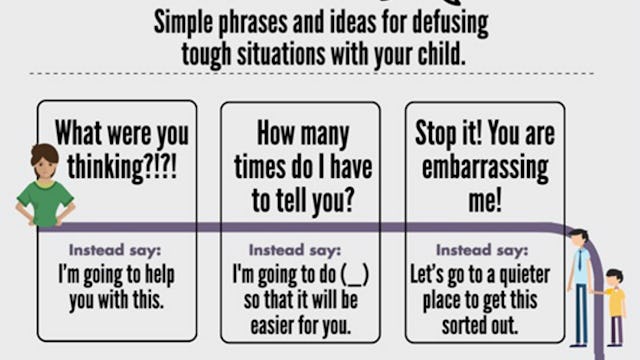 So, for example, as the meme points out, instead of saying “What were you thinking?” any time your child is out of line, try replacing it with something like, “I’m going to help you with this.”