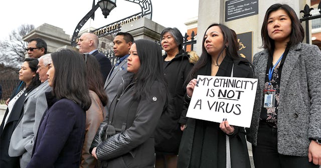 Members of the Asian American Commission hold a press conference on the steps of the Massachusetts State House to condemn racism towards the Asian American community because of coronavirus on March 12, 2020 in Boston. John Tlumacki/Getty