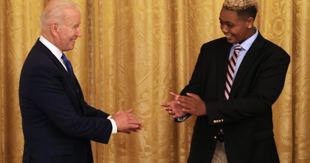 Following his introduction by Mota, President Biden commented that the teenager “seemed awfully comfortable up here,” nodding toward his podium.
