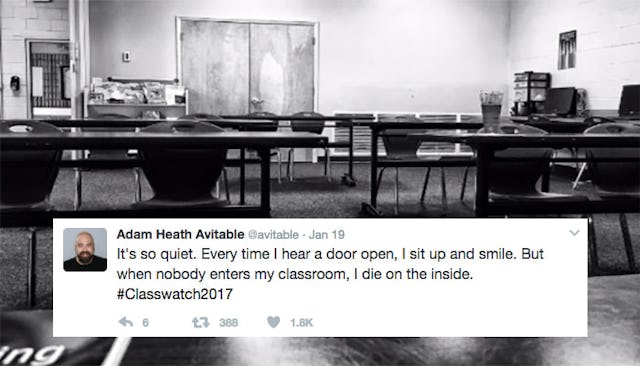Using the hashtag #Classwatch2017, Avitable’s tweets trace the professor’s slow descent into madness as he waits… and waits… and waits for someone – anyone! – to show up. He refers to himself as a “storyteller” and “comedian” in his Twitter bio, so we thought we’d let his tweets speak for themselves.