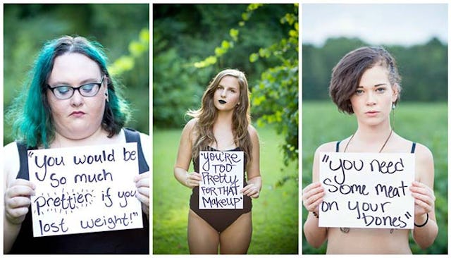 The striking images are reminiscent of all the ridiculous beauty and body standards we put upon ourselves. They’re also a painful reminder of hurtful things we say to one another based on these unnecessary standards. The women’s willingness to share these comments is inspiring.