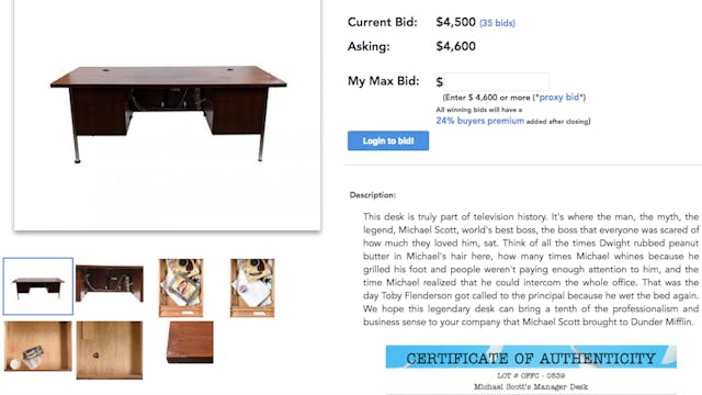 A 24% buyer’s premium is added to each bid. Each item comes with a certificate of authenticity, so you can be totally and absolutely sure that your The Office desk lamp is not just a normal run-of-the-mill desk lamp. Shipping is $14.95 within the United States and $24.95 internationally, with large, heavy, or fragile items costing more to package and ship. Shipping takes two weeks — but it could be up to eight weeks for super-large items, like the sign we just have to have mentioned above.