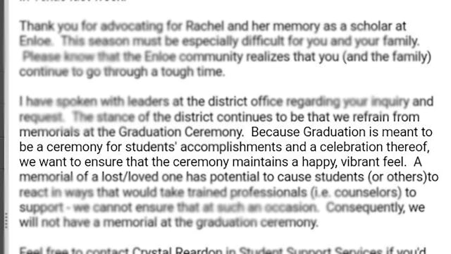 “I have spoken with leaders at the district office regarding your inquiry and request,” the email reads. “The stance of the district continues to be that we refrain from memorials at the Graduation Ceremony. Because Graduation is meant to be a ceremony for students’ accomplishments and a celebration thereof, we want to ensure that the ceremony maintains a happy, vibrant feel.”