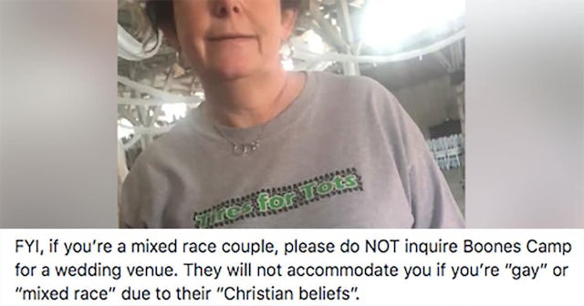 In the video, you can hear the woman being filmed saying, “First of all, we don’t do gay or mixed race.” When pressed she says, “It’s because of our Christian race.” Then she quickly corrects herself with “Christian beliefs.”