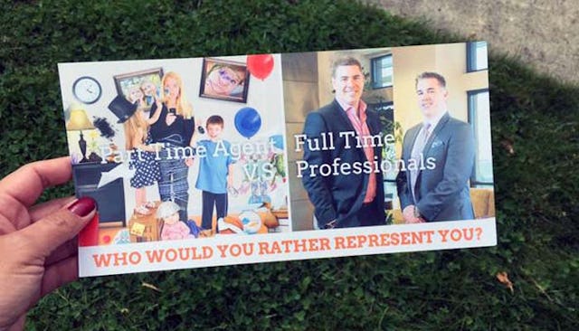 A real estate ad that’s circulating around Seattle right now asks, “Who would you rather represent you?” My immediate answer is, “the woman on the left used to juggling 40 things at once in an environment of total kid-chaos. Definitely not the smug assholes on the right.” According to Costello and Costello Real Estate Group, my answer is WRONG.