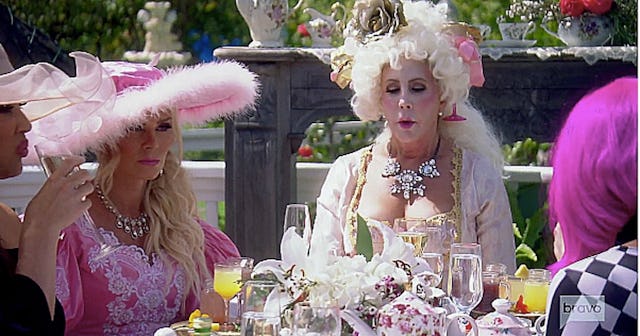 After watching Tamra Judge, Shannon Beador, and Vicki Gunvalson shop for costumes for Vicki’s “Queen Victoria” royal, high-tea birthday bash and watching Kelly Dodd reject Tamra’s invitation, we finally arrive to the big moment: the outdoor, tea garden-themed party. Gina arrives donning an over-the-top, sexy-Mad Hatter costume, complete with a neon pink-hued wig. It’s the only costume that really matters among the women because it’s so out-of-place. Oh, right, and Gina reveals she started sleeping with Matt, her ex-husband, again — to which Braunwyn responds, “Good for you for making bad choices. It just makes me feel less alone.”