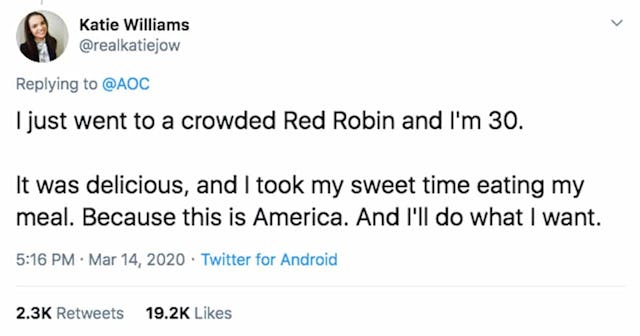 “I just went to a crowded Red Robin and I’m 30,” Katie Williams, former Ms. Nevada State and candidate for the Clark County School Board of Trustees in Las Vegas, tweeted. “It was delicious, and I took my sweet time eating my meal. Because this is America. And I’ll do what I want.”