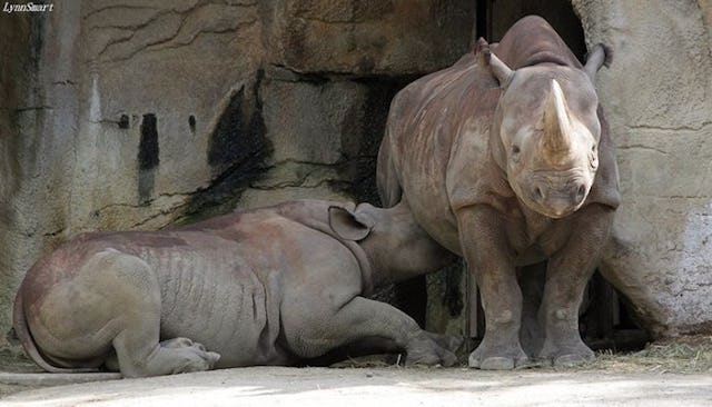 Before we dive headfirst into those, however, here are some quick facts about mama rhinos and the way they care for their young. First, the rhinoceros gestation period is 18 months long. Which, whew. Secondly, according to RhinosInfo.com (God bless the internet), calves typically nurse for a week or two only. The mothers usually teach them how to subsist on local vegetation. But don’t tell that to Kendi or Seyia, who are defying the rules of nature and doing their own thing.