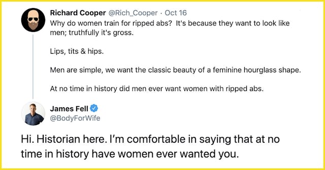 Cooper felt so strongly about this analysis of his that even as the burns started rolling into the replies section, he didn’t delete it. You know, so it could reach as many women as possible and let them know that they need to stop working out right away. We need to take heed, ladies! According to Richard, at no time in history has it been acceptable for us to have rockin’ six-pack abs. Though, that doesn’t actually sound quite right. If only we had some sort of history expert to help us out with this.