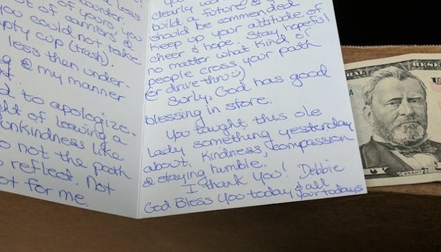 She asked if he’d been working the day before, and when he said yes, she handed him a card that contained a handwritten apology and a crisp $50 bill. Richardson not only got some extra cash from the encounter, he’s also experiencing a small level of fame as the picture of the note that he posted on Reddit is going viral.