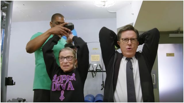 Colbert hit the gym with Ginsburg — who was wearing a “Super Diva” shirt — and learned first-hand that the Justice takes her routine very, very seriously. At first, the talk show host was a little skeptical about the whole thing (“If I had a lifetime appointment to a job that let me wear a robe, I would definitely let myself go”), but then committed himself to getting “fully ripped and exploded.” He was with the pro, after all.