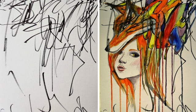 In a series she calls “A painting collaboration with my toddler,” the Canadian artist takes what most parents would view as scribbles and uses them as a starting point for her whimsical paintings.