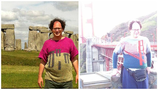 “I started knitting in March 1999 and made two solid colored sweaters followed from a pattern,” Barsky told Mashable. The following year he wanted to challenge himself and his crafting abilities, so he made his own pattern-free picture sweater. Since then, he’s created 103 masterpieces featuring various exotic locales like Stonehenge and the Bahai Gardens.