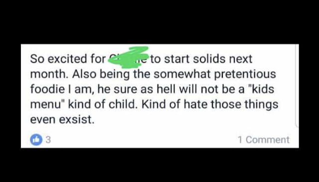 “So excited for XXX to start solids next month,” she wrote in a post shared anonymously by the popular Facebook page Sanctimommy. “Also being the somewhat pretentious foodie I am, he sure as hell will not be a “kids menu” kind of child.” So, every child then? “Kind of hate those things even exist.”