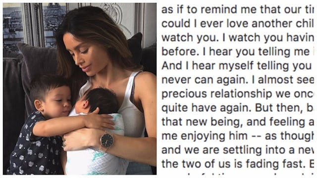Welcoming a second child after only knowing motherhood with your first baby can be a whirlwind of emotion, all of which are captured perfectly in a poem shared by one mom who’s recently had to split her maternal affections between her toddler and her new baby.