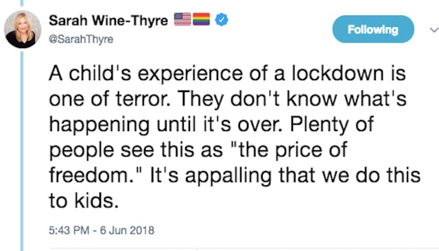 A chilling statement like that coming from a child who should feel safe in school is hands-down the most depressing thing about where we are as a country. And Wine-Thyre’s daughter, though her school’s lockdown wasn’t a drill, isn’t alone — according to the National Center for Education Statistics, as of 2015-16 “lockdown drills” were being performed in 94.6 percent of schools in the U.S.