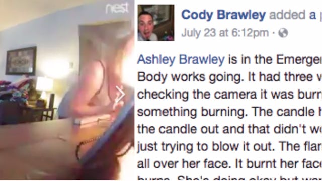 Brawley’s husband, Cody, posted the security video on Facebook, alongside a photo of Brawley in the hospital with bandages covering her face. In the video, you can see bright, flickering lights from the candle flame, burning with no one in the room. Brawley walks in, rushes over to the candle and tries several times to blow it out, before the flame expands and engulfs her face.