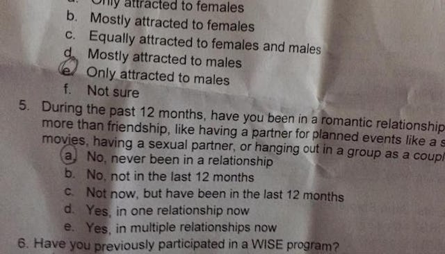 “Have you been in a romantic relationship?” it reads. “By relationship, we mean more than friends, like having a partner for planned events, like a school dance, going to the movies, or having a sexual partner.”
