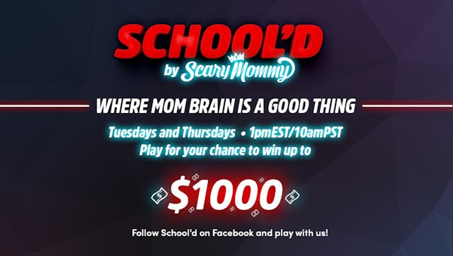 Introducing School’d by Scary Mommy, a trivia show for moms! Playing is easy. Follow School’d on Facebook and tune in every Tuesday and Thursday at 1 pm Eastern, 10 am Pacific for a chance to win a piece of $1,000.