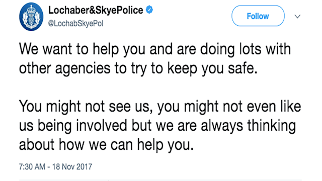 “A letter to a young woman in Skye. We know you follow this account and want you to see this,” they said. “We’ve told you previously that we think you are at risk of domestic abuse from your partner.” They went on to say “You might not see us, you might not even like us being involved but we are always thinking about how we can help you.”
