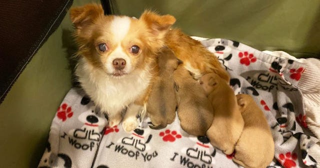 Founder and Executive Director Rachel Mairose tells Scary Mommy at the same time Rosa was in transit to their rescue, they got a call from a local reservation about a mom of similar breed (Rosa is a long-haired chihuahua), who died suddenly, “leaving behind 5 fat two week old puppies.” She said when they receive puppies that young (they have a neonatal program so it happens often), they always try to bond them to a nursing mom of similar breed to “not overwhelm the mom.”