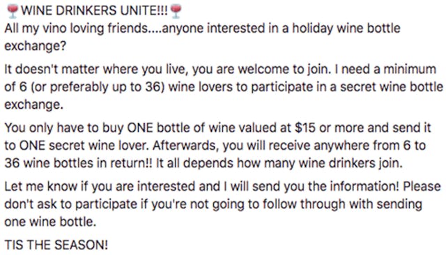 Us moms are a vulnerable crew when it comes to the phrase “free wine.” Say it and we perk up like our kids when they hear us opening a snack we weren’t planning to share, and it’s that exact desperation nefarious Facebook forces are preying on with this ridiculous holiday wine gift exchange. We’re going cross-eyed trying to do the math to figure out how it would even work, but bottom line, it does not.
