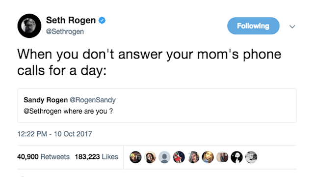Seth Rogen shared his mom’s tweet the next day with a simple “when you don’t answer your mom’s phone calls for a day.” We feel you, Seth. And so did Twitter.