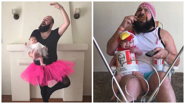 Let’s face it — babies can be a little boring. Until they can talk back and hold their heads up reliably, caring for an infant amounts to a lot of thankless work. The overall experience can definitely use some levity, and one dad found it by creating staged photos of himself and his baby girl in costume.
