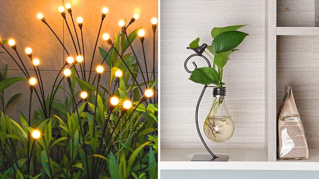 If you dream of the warm glow of fireflies dancing around your garden, you’ll love these delicate solar lights designed to mimic the soft, fluttering light. Each one has a cluster of eight waterproof bulbs on flexible wire stems that sway in the wind. They’re sure to add a whimsical touch to your garden.