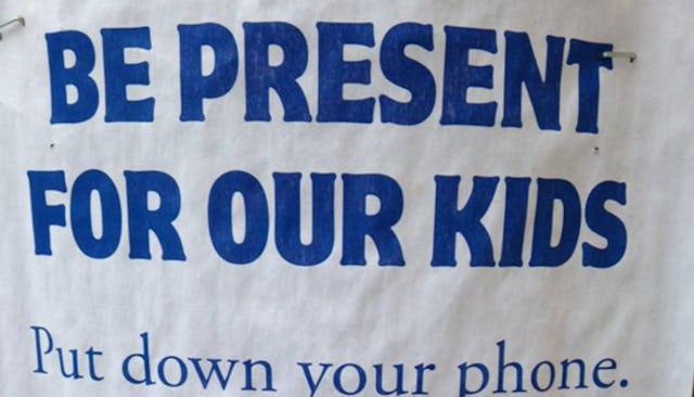 Signs posted in a San Francisco neighborhood implore parents to put down their phones and “be present”
