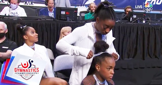 Miller — whose USA Gymnastics profile adorably states that she got into the sport because “my mom signed me up” — is seen waiting for her turn to compete as Biles sits her down and makes sure that her hair ribbon is perfectly in place, and I’m calling it one of the sweetest moments in sports history ever.